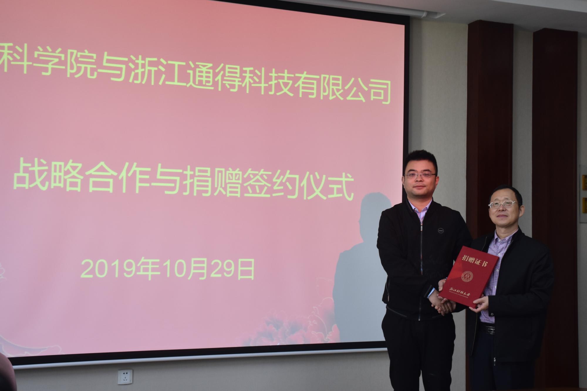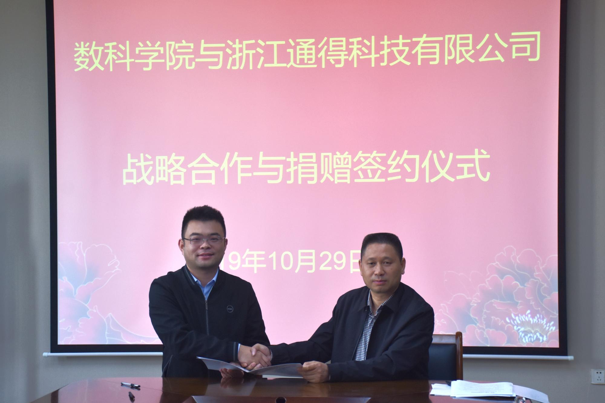 与浙江通得科技股份有限公司(以下简称“通得公司”)签订战略合作协议,双方联合成立通得“思源”大数据发展基金。通得公司领导,数科学院院长洪兴建、党委书记周君兴、副书记刘向前、副院长罗季以及学院其他部门代表出席签约仪式。