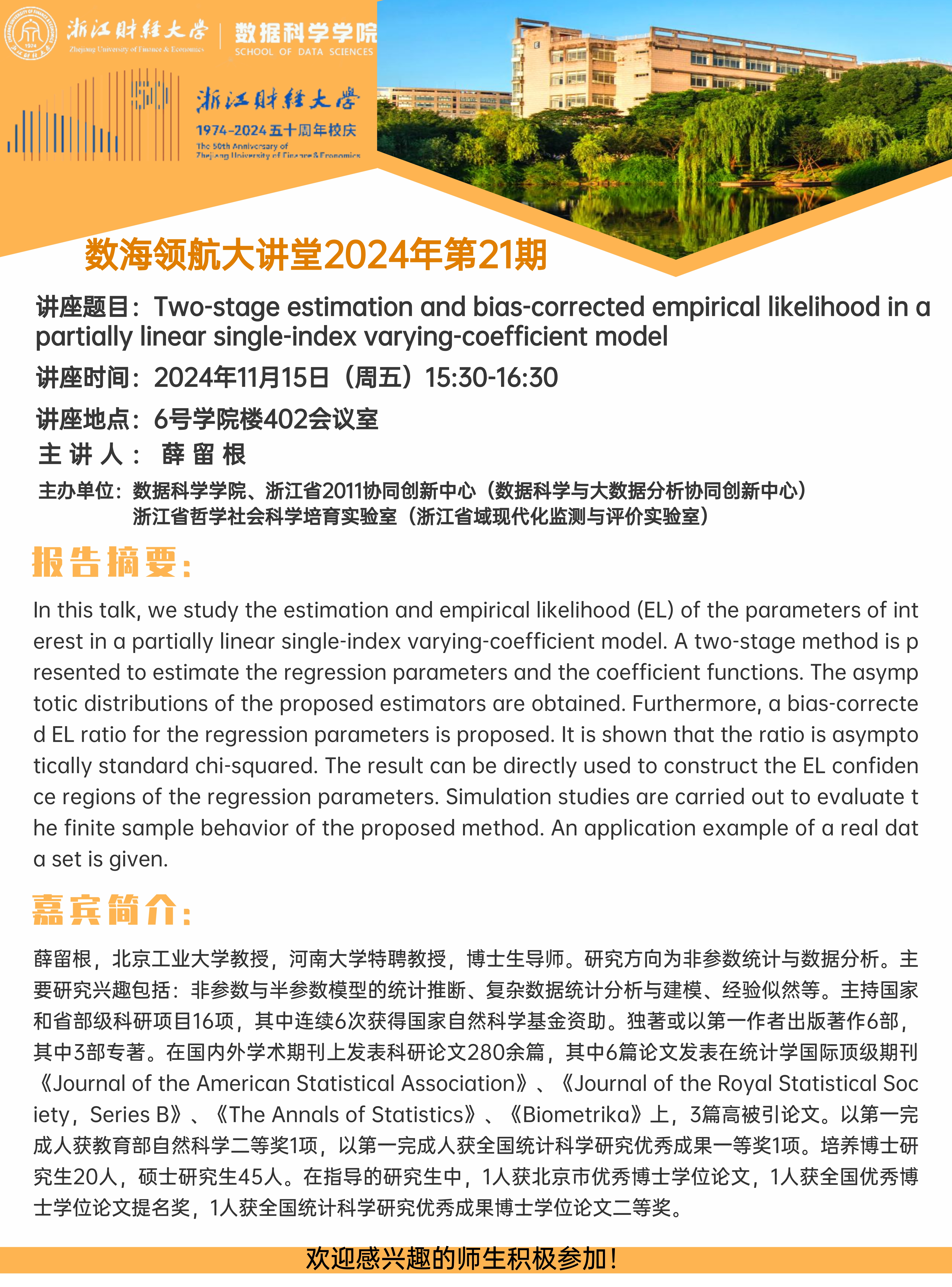 上一条:数海领航大讲堂2024年第22期——中国社会科学院李金华教授 下一条:数海领航大讲堂2024年第20期——华东师范大学汤银才教授