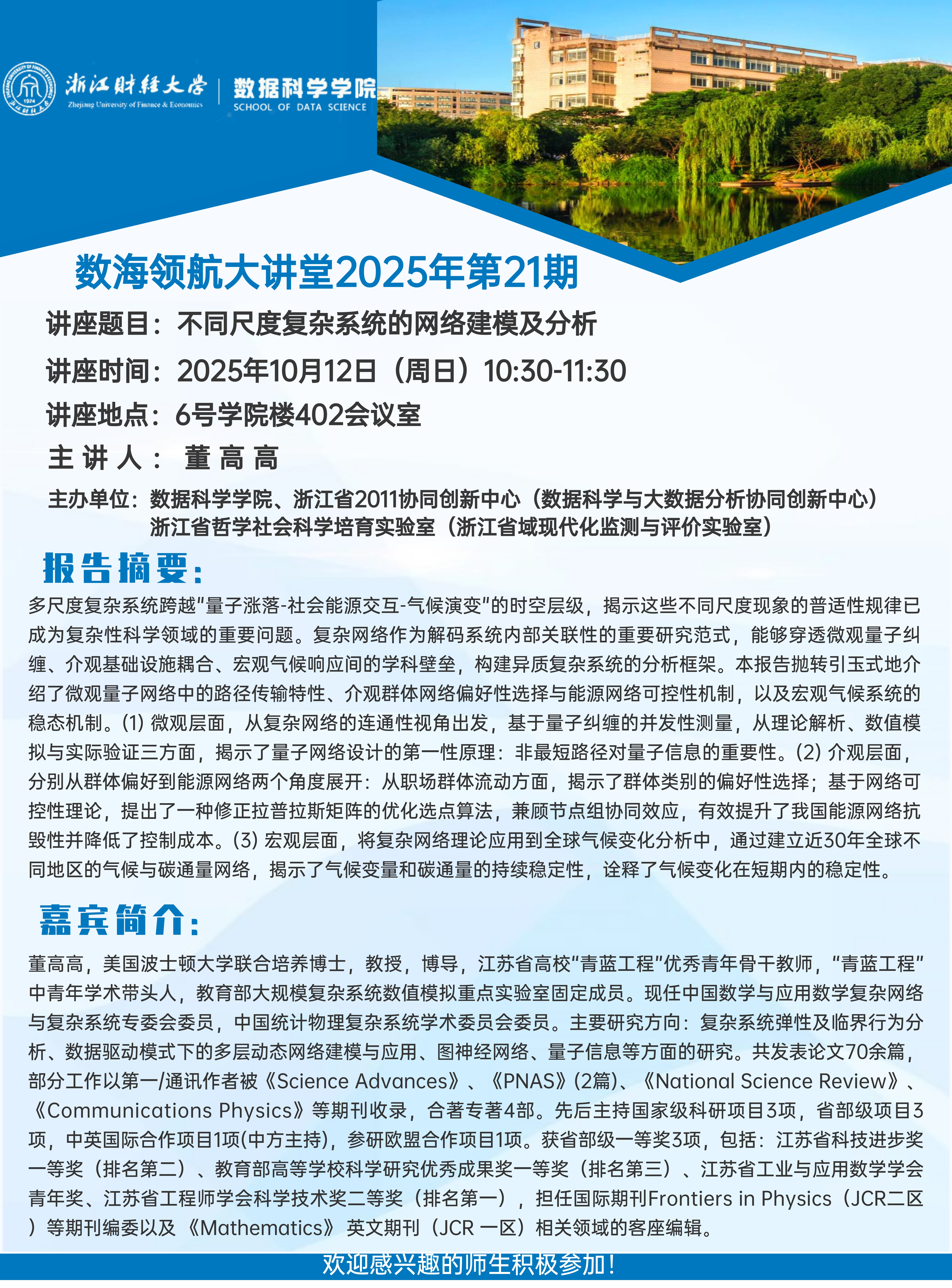 上一条:复杂高阶网络上的合作演化动力学研究——数海领航大讲堂2025年第20期讲座开讲 下一条:数海领航大讲堂2025年第20期——天津工业大学夏承遗教授