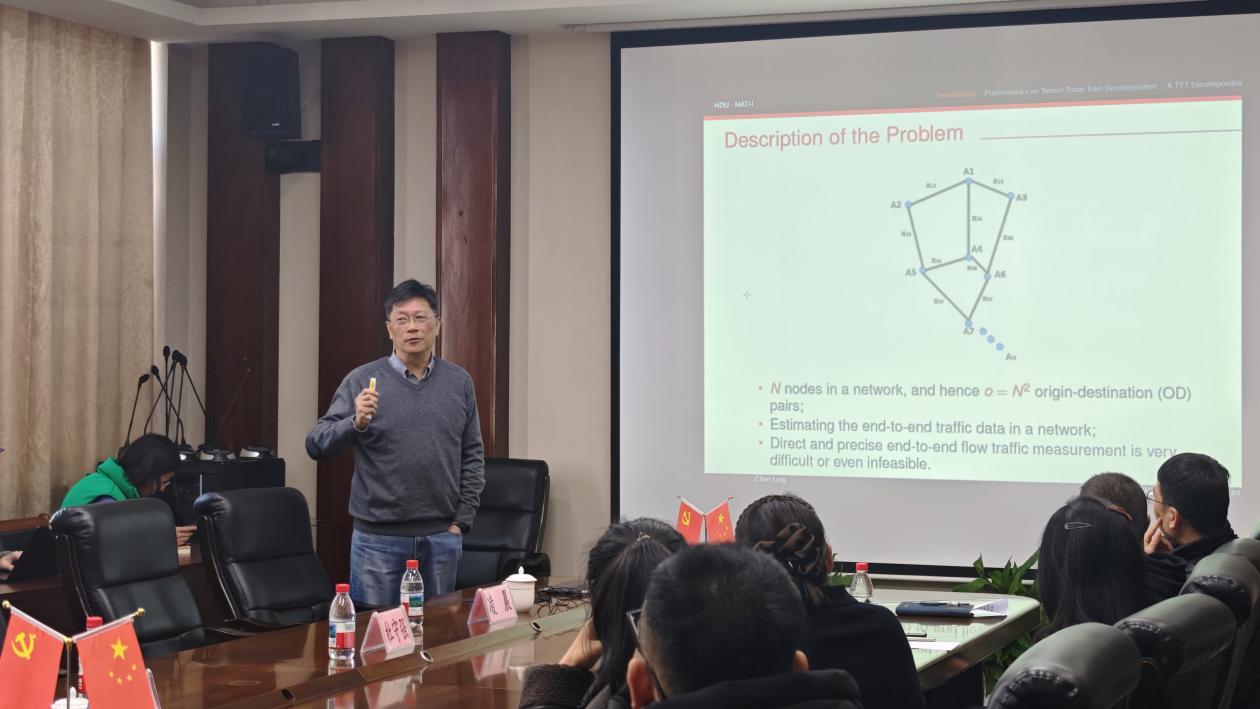 举行数海领航大讲堂2025年第28期。本期邀请杭州电子科技大学/太原师范学院的凌晨教授为全院师生带来一场题为“TA novel tensor decomposition-based approach for internet traffic data recovery and forecast”的学术讲座。讲座由副院长郑松教授主持,部分教师及研究生参加了此次讲座。