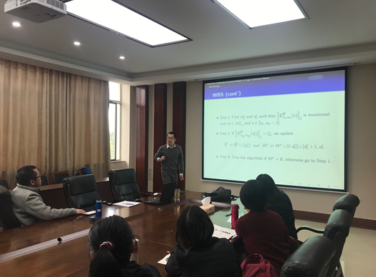 报告会上,李德柜教授首先介绍了协方差矩阵估计在现代数理统计、生物统计、计量经济学等领域中的重要作用,例如投资组合理论的发展就离不开协方差矩阵的估计等。随后,李德柜教授详细介绍了新的模型设定,并且讲解了在新的模型中估计协方差矩阵变点的Binary Segmentation方法。最后,李德柜教授将研究结果与现有文献的结果比较,进一步论证了结果的可靠性和优良性,并将结果运用于英国房地产价格波动的数据研究中。