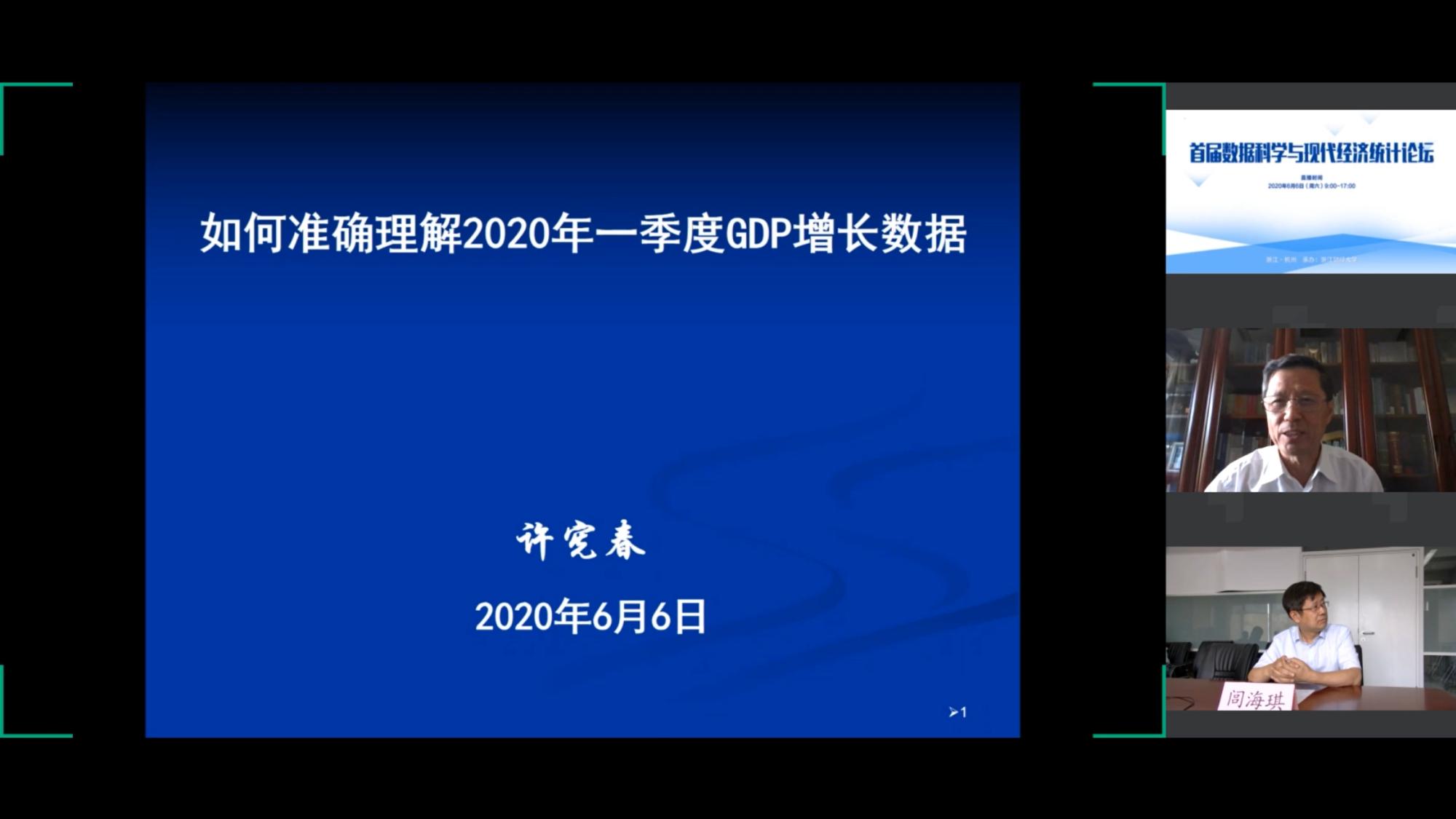 本次论坛设置了四场特邀专家主题报告。第一场报告由国家统计局统计科学研究所所长闾海琪主持,来自清华大学的中国经济社会数据研究中心主任许宪春教授作了题为“如何准确理解2020年一季度中国GDP增长数据”的主题报告,详细研究和解答了社会对于在新冠疫情对中国经济造成严重冲突背景下官方发布的GDP增速数据的一些质疑。