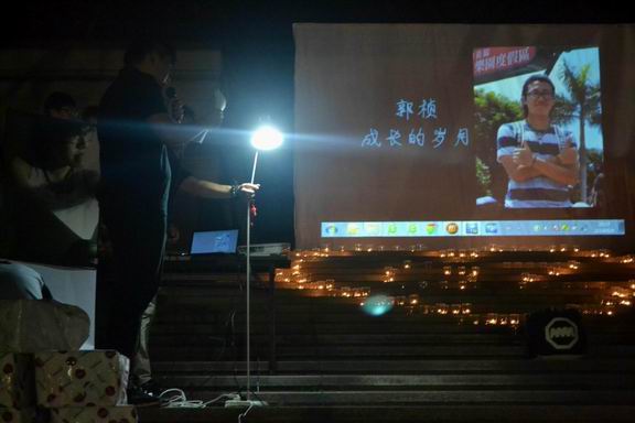 当天晚上,有近一百多人参加了追思会,前来纪念他的同学们都手持白花,庄严地站在台阶上,静静地聆听着。在他们前面,郭桢同学生前的照片在屏幕上不断出现。