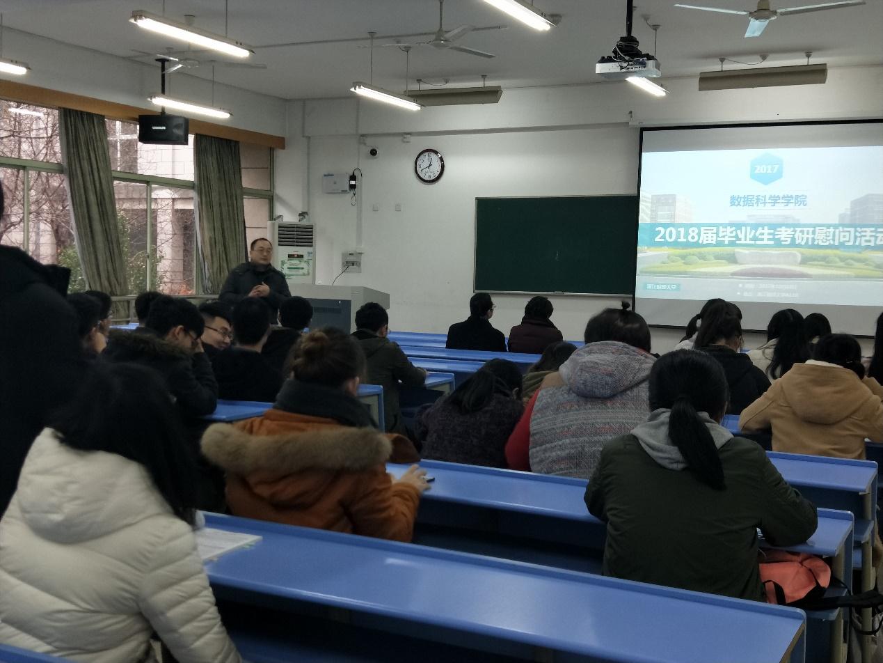 在A110教室开展了给考研学子送温暖的慰问活动,给考研学子加油鼓劲,增添动力。数据科学学院党委书记副院长周君兴老师、副院长罗季老师、党委副书记刘向前老师、学办主任李钊军老师和江挺老师出席了此次活动。