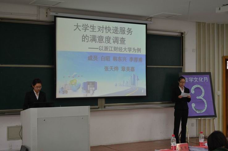 在启动仪式上,社管中心负责人马司妮同学向大家介绍了此次数学文化月的主要活动,并展示了第一届及第二届数学文化月的成果。随后,进行了数学与统计学院第四届新生科研创新项目报告会,这是每年数学文化月的重要活动之一。参加此次报告会的一共有22个新生小组,他们在上个学期确定选题和设计调查方案,利用课余时间发放问卷进行数据采集和分析,最终撰写出调研报告。在报告会上,各个小组代表依次上台进行5分钟的PPT展示,他们用缜密的思维,精炼概括的语言向大家介绍了论文的大体思路,随后评委则对他们的报告进行提问与点评,整个过程紧张、激烈又精彩纷呈。这些项目内容丰富,有的紧扣大学生生活实际,如关于选课制度、团书馆资源利用情况的调查,有的则关注社会民生和时事热点,如关于杭州市全科医生运行模式、杭州市定制公交发展前景的调研等,充分体现了同学们思考、分析问题的能力以及洞察社会的敏锐视角。
