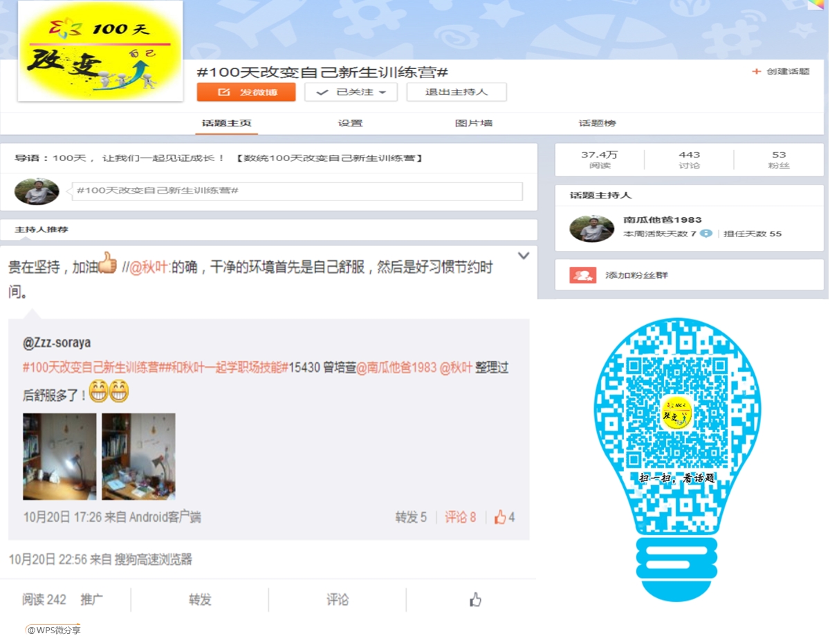 本项目以8次课程为主体,主要包括大学生自我管理、事务管理,学业规划、生涯探索等四个方面,所有课程都是通过网络APP进行。同时,为了提高学生的行动力,每次课程都配套了相应的课后作业。这些作业有较强的实践性,主要包括整理个人桌面、画生命之花、写行业调查报告、设计学业规划书、做职场人士访谈、制定个人战略等,并要求完成作业后要通过网络提交,让新生相互交流学习。同时,部分作业要求以团队形式完成,在这个过程中新生学会了团队合作,真正让学生在行动中体验到成就感。项目启动后,学院就在新浪微博创建了#100天改变自己新生训练营#话题组,新生们完成作业后就通过个人微博发布到这话题组,目前这个话题组阅读量达到了37万,有439条讨论,尤其在整理桌面作业提交中,得到了网络红人@秋叶老师关注和支持,进一步扩大了活动的影响力。