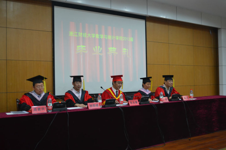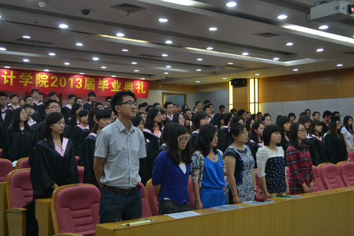 在学术二号报到厅举行2013届毕业典礼。参加毕业典礼的领导有校党委副书记朱永康老师,数学与统计学院党总支书记、副院长杨辉煌老师,副院长邱瑾老师,党总支副书记周君兴老师,应用数学系主任郑光老师。