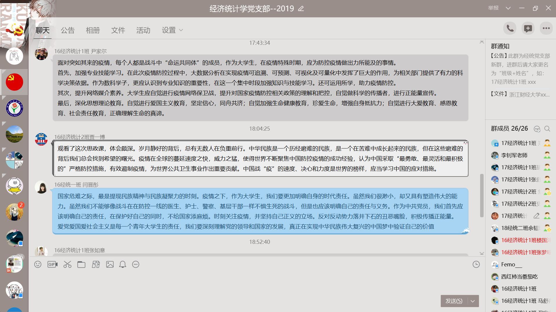 本次直播学习中,学院各党支部书记、辅导员、各班团支部积极配合工作,上传下达,通知到每一位党员、每一位学生,并为观看存在问题的同学出谋划策。据统计,当天下午学院共6个支部、23个班级,900余名师生共同观看了思政大课堂。观看结束之后,研究生党支部以《发挥制度优势,坚决打赢疫情防控战》为主题开展了线上讨论,大家多方位剖析了当前国家应急管理制度、医疗保障制度等在这场疫情防控中发挥的作用,深入讨论了如何继续发挥制度优势,彻底打赢疫情防控战。经济统计本科生党支部以《逆行青春》为主题,分享了疫情防控战中许多青年的优秀事迹,讨论了如何提高大学生的社会责任感和爱国主义精神。应用统计本科生党支部以《战“疫”家书》为主题,收集了在这场人民战争中医务人员、社区工作者、志愿者等以各种形式书写的家书,讨论了这些家书中体现的中国精神。数学系本科生党支部则以《关于抗击疫情中的中国数据》为主题,整理了抗击疫情过程中的相关图表、动态数据分析视频等,以数据为有力证据,证明了中国在抗击疫情过程中的巨大投入,以及科学防控的效果。学院领导班子、教工各支部、 辅导员们都积极在QQ、微信、钉钉等平台上与学生展开线上讨论和交流。