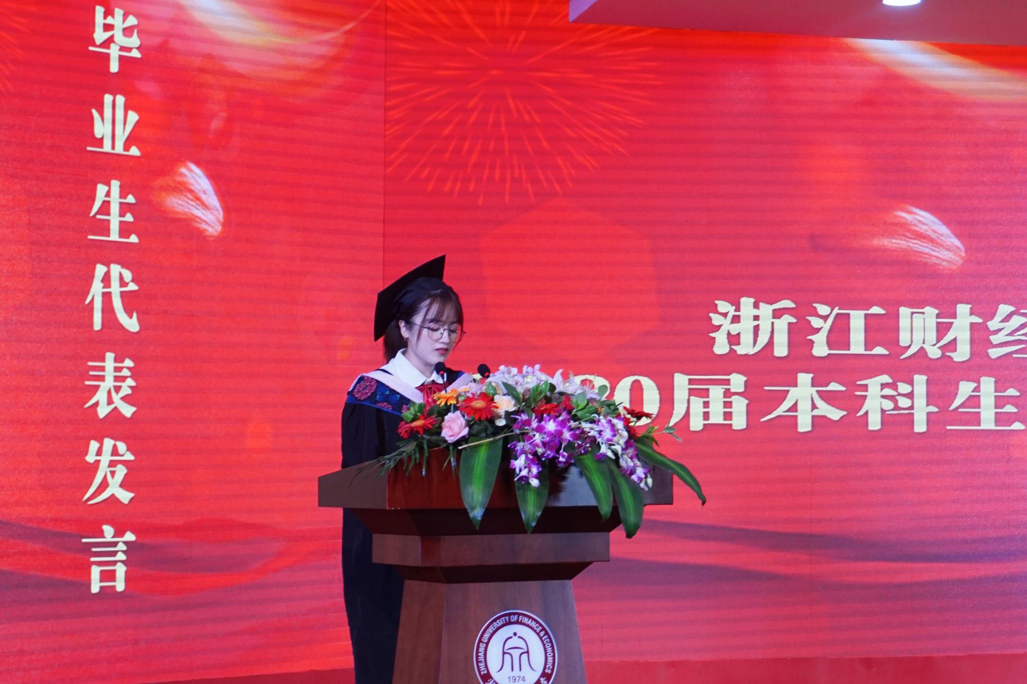 毕业生代表、16经济统计1班张如意同学在发言中回顾了大学四年生活学习和工作中的点点滴滴,深切表达对学院老师的感激之情和对同学的不舍和祝福。