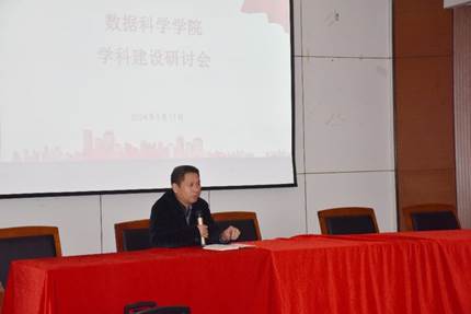 学科发展的基本布局,对学院的学科发展现状进行梳理并指出了学科发展存在的不足与短板,然后深入剖析了下一步学科建设的重点,特别提出了数学学科发展的可行性方案,一方面是改进优势特色学科研究范式、提升成果质量,另一方面是充实公共数学课的内容、提升教学质量。最后,洪院长还强调学科发展要依托高质量师资队伍、科学研究、平台建设的同步提升。学院副院长刘波和郑松分别就科研成果转化和人才引进提出建设性意见,与会教师也围绕学科建设纷纷建言献策,会场气氛热烈融洽。