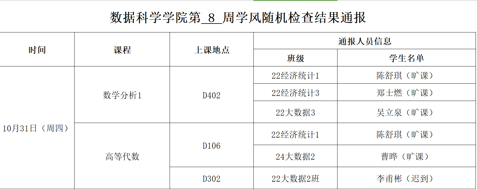 10月31日上午,漫画柜 开展学风督查,漫画柜 2024级新生辅导员徐翠、王彤彤、陈璐开展新学期学风第三次督查工作,对新生各班级课堂考勤、纪律及听课情况等进行随机检查。现将本次随机检查结果通报如下: