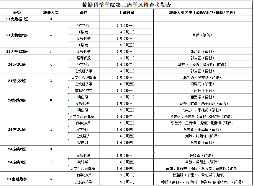 学院后续将常态化开展学风巡检抽查,希望同学们严守课堂行为规范,禁止“三无”行为,杜绝旷课、迟到、早退、代课等不良现象,共同营造“好学、勤学、乐学”的优良学气。