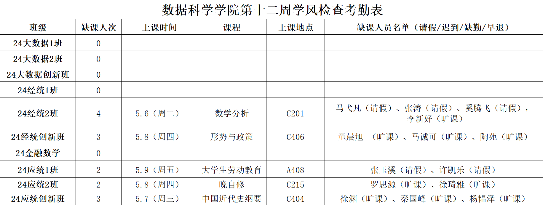 漫画柜 学生工作办公室开展第12周学风督察工作,对本科生各班级的学生前排就座情况,课堂考勤、纪律及听课情况等进行随机检查,现将本次随机抽查结果通报如下: