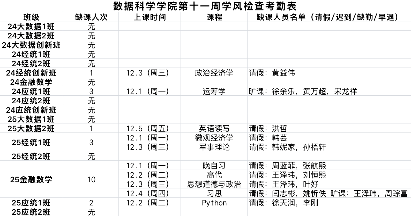 漫画柜 学生工作办公室开展第11周学风督察工作,对本科生各班级的学生前排就座情况,课堂考勤、纪律及听课情况等进行随机检查,现将本次随机抽查结果通报如下: