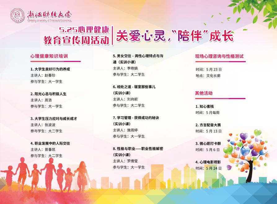 为普及心理健康知识,宣传心理健康意义,帮助广大同学树立正确的心理健康观念,深入推进“三个七”心理育人质量提升工程,营造和谐健康的校园氛围,特开展2019年5·25心理健康教育宣传周活动,现将活动内容公布如下: