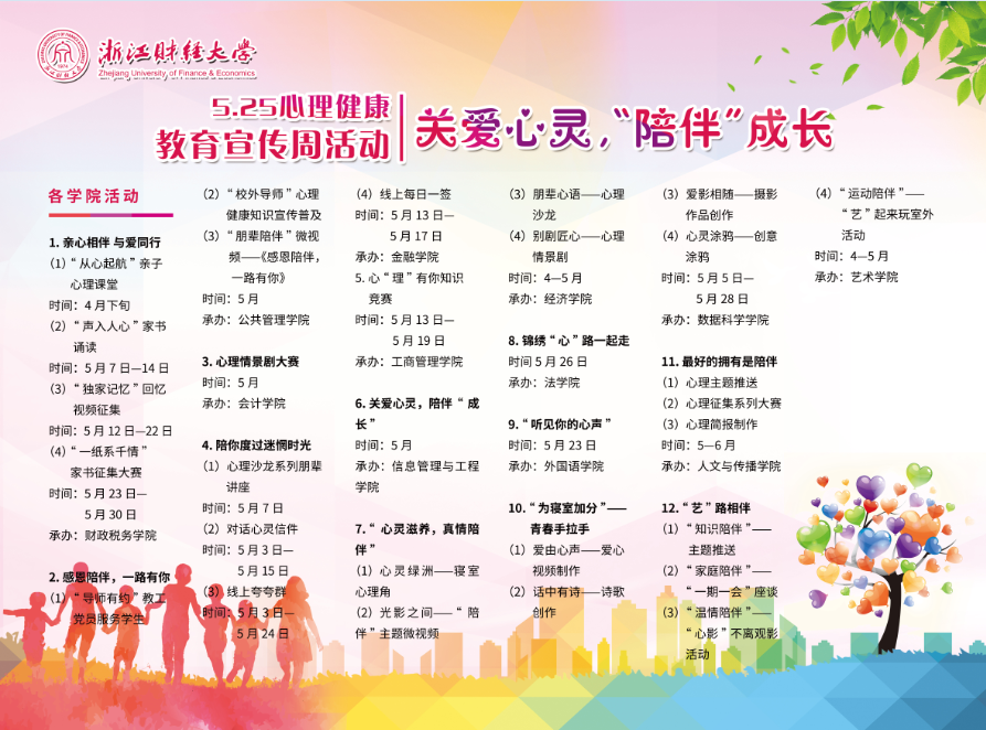 本次宣传周活动包括校级和院级两个层面,校级活动由学生处和校心理健康教育与咨询实验中心共同组织,院级活动由各学院结合各自品牌项目面向全校学生开展。