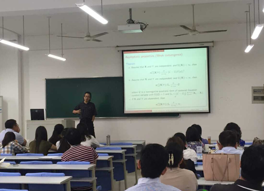 讲学,做了题为“A new measure for testing independence”的专题讲座。数学与统计学院部分老师及全体研究生参加了此次讲座。报告会由数学与统计学院副院长,邱瑾教授主持。