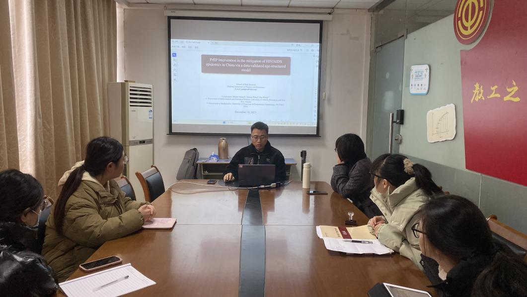 暨数据科学与大数据分析协同创新中心举办了2023-2024学年第二期学术沙龙。金融数学系吴鹏博士为师生带来了一场题为“PrEP Intervention in the Mitigation of HIV/AIDS Epidemicsin China via a Data-Validated Age-Structured Model”的学术报告,报告由金融数学系主任孙洁副教授主持,十余位教师和研究生参加了报告。