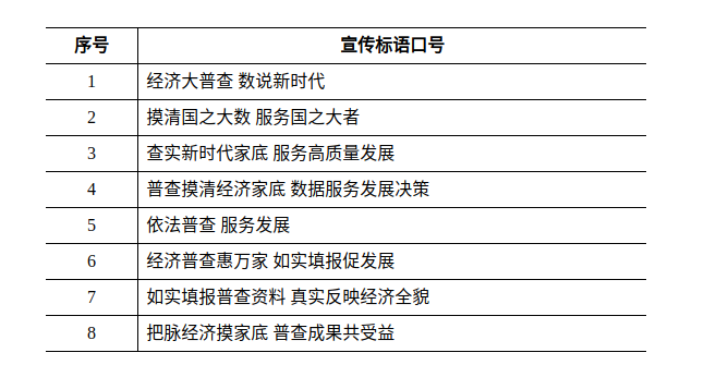 为做好第五次全国经济普查宣传工作,动员社会各界支持配合经济普查,日前国务院第五次全国经济普查领导小组办公室开展了第五次全国经济普查宣传标语口号征集活动。此项活动得到社会各界的大力支持和积极参与,共收到投稿6500余条。经认真筛选、评审,共评选出8条优秀作品,将用于全国经济普查宣传活动。现将评选结果通告如下: