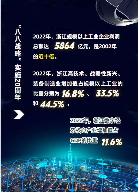 工业经济质量效益稳中有进。浙江工业增加值从2002年的3670亿元增至2022年的28871亿元,扣除价格因素,年均增长9.3%。2022年,规模以上工业企业利润总额达5864亿元,是2002年的近十倍;规模以上工业劳动生产率29.6万元/人,相较2002年的5.8万元/人提高23.8万元/人。