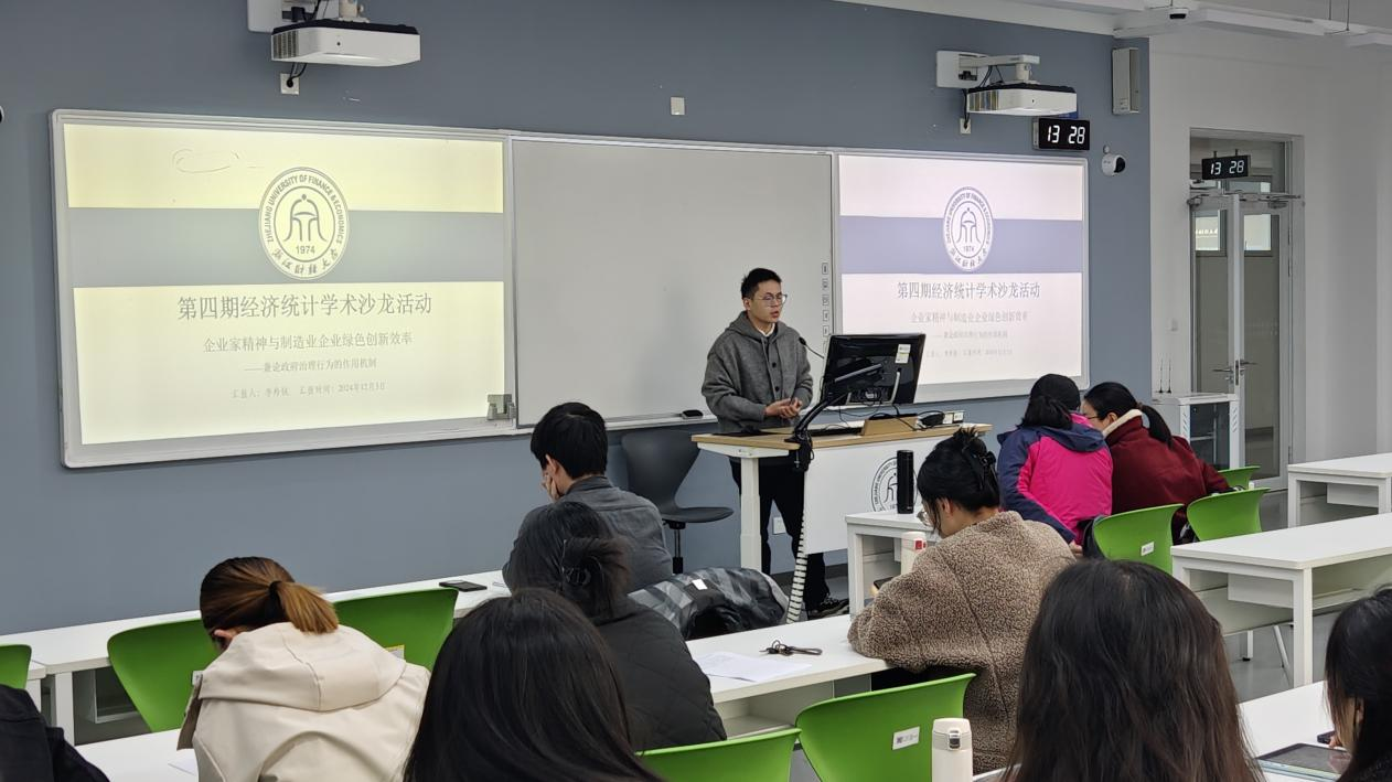 李羚锐作题为《企业家精神与制造业企业绿色创新效率—兼论政府治理行为的作用机制》的学术报告,他从微观层面探讨企业家精神对绿色低碳发展的推动效果,运用大语言模型与制造业数据量化企业家精神,实证其对企业绿色创新效率的提升作用,并深入分析政府治理行为在这一过程中的作用机制。