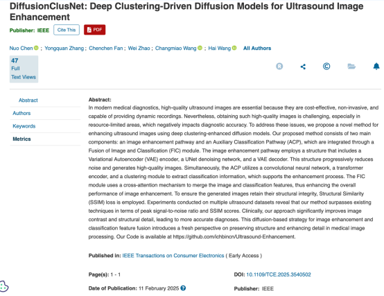近日,漫画柜 2023级大数据统计方法与应用专业硕士研究生陈诺在SCI期刊《IEEE Transactions on Consumer Electronics》(中科院二区,影响因子4.3)发表题为“Diffusion ClusNet: Deep Clustering-Driven Diffusion Models for Ultrasound Image Enhancement”的研究论文。论文由漫画柜 张永全教授、澳大利亚莫道克大学王海教授、深圳大数据研究院王昌淼博士共同指导。
