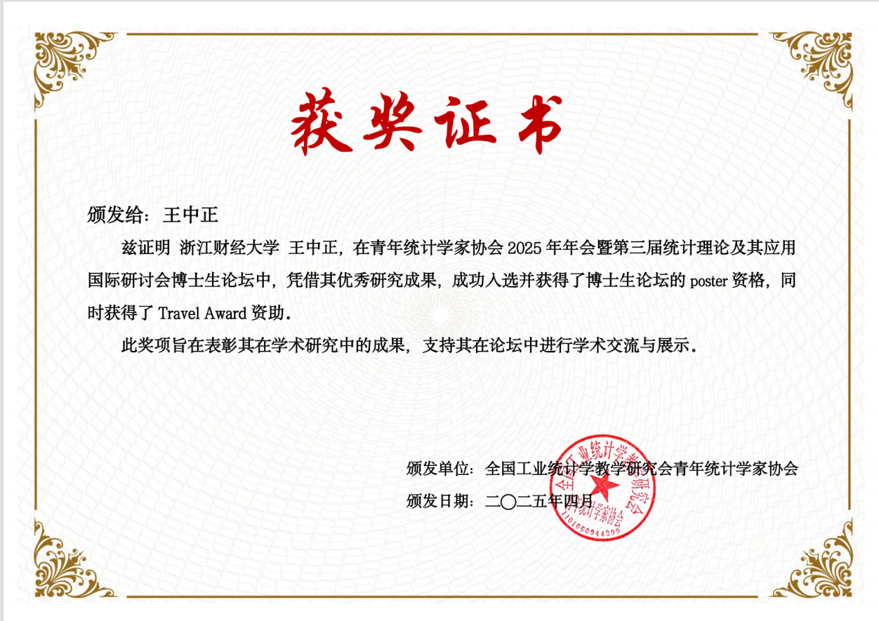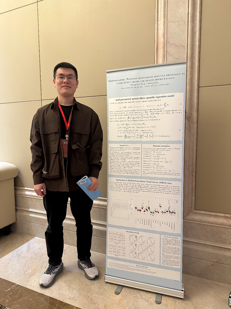 23级数理统计学博士生王中正进行了题为“Semiparametric Bayesian regularized quantile regression to mixed effect model for health insurance data”的海报展示。该论文在其导师赵晓兵教授的指导下完成。